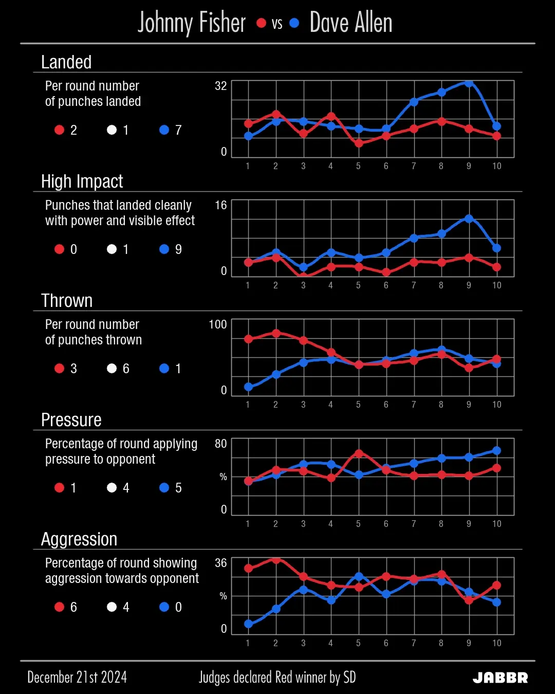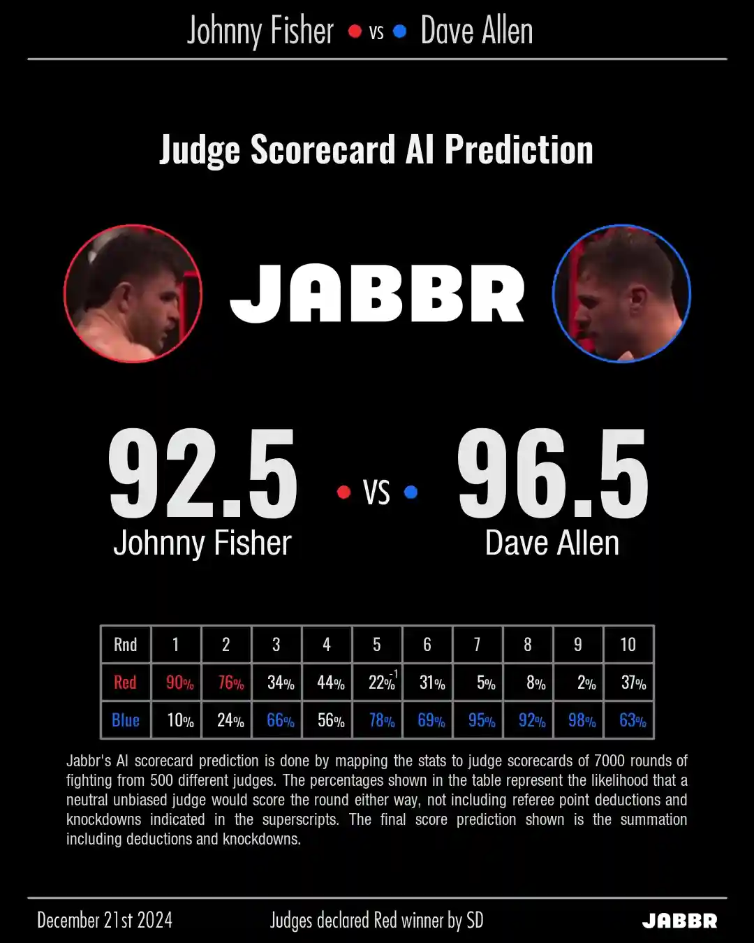This prediction maps AI-generated fight stats to scorecards from 7,000 rounds judged by 500 officials. The AI weighs impact categories, pressure, and aggression to best match human judging patterns.