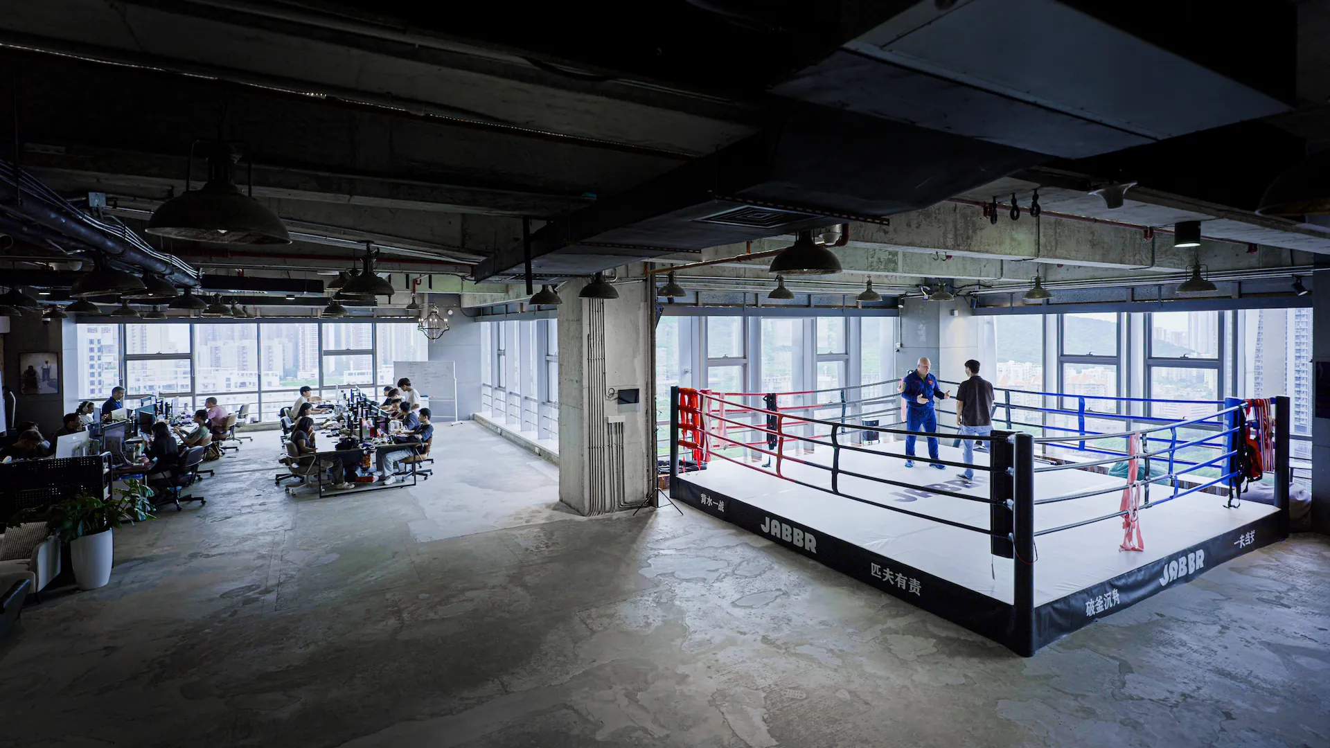 . Raw concrete floors. Exposed Brick. Panoramic windows overlooking the tech capital of China. This was the perfect place to build Jabbr HQ.